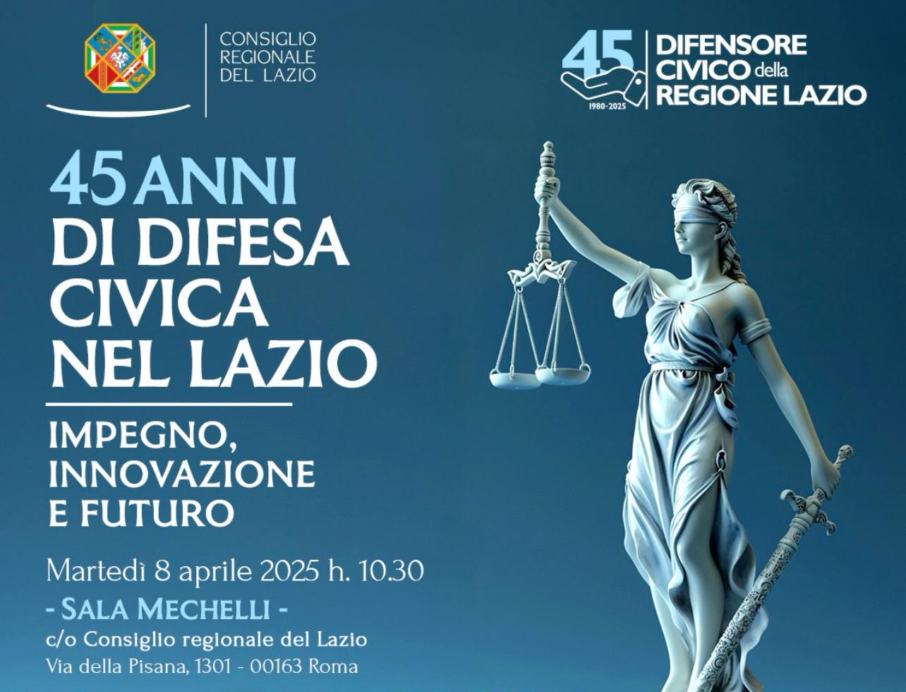 Il Consiglio regionale del Lazio celebra il 45° anniversario della Difesa Civica con un evento istituzionale che ripercorre la storia e il ruolo essenziale del Difensore Civico nella tutela dei diritti dei cittadini e nella garanzia di un’amministrazione pubblica trasparente ed efficiente. L’incontro, che si terrà presso la sede del Consiglio regionale l’8 aprile 2025 presso la sala Mechelli dalle 10:30 alle 13:00, vedrà la partecipazione di autorevoli rappresentanti istituzionali, del mondo accademico e della società civile.