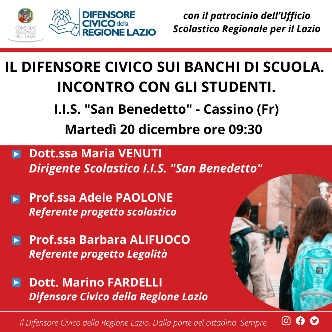 Il 20 dicembre alle ore 9:30, nell’ambito dell’iniziativa “Il Difensore civico sui banchi di scuola” presso l’istituto di istruzione superiore “San Benedetto” di Cassino, Marino Fardelli, Difensore civico del Lazio, incontrerà gli studenti, con lo scopo di far conoscere ai ragazzi ruolo e funzioni di questo organismo.